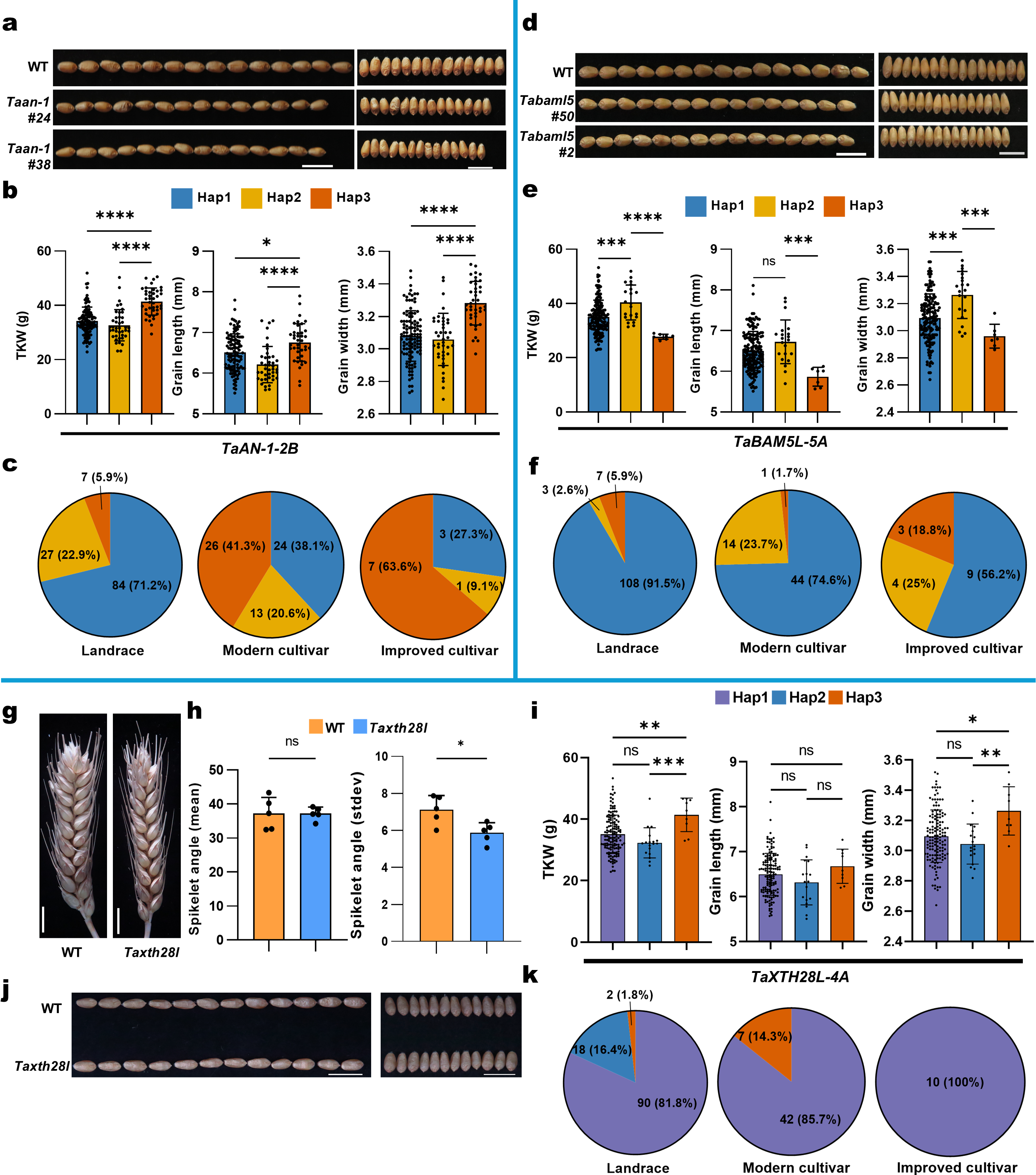 该研究以我校李俊明教授培育的小麦品种“科农9204”为材料,在前期构建的EMS近饱和突变体库基础上,采用基于深度学习的图像表型鉴定平台,对约2000个突变株系进行高通量图像采集与表型解析,共获取83个株型及穗部相关性状。为解决EMS突变体中低频突变难以有效解析的问题,研究团队锚定该突变体库的外显子捕获测序数据,开发了适用于EMS突变体库的全基因组关联分析的新方法GH-GLA(GeneHunter-Gene-Level Association),并从小麦中鉴定到5905个重要性状相关候选基因。研究团队进一步利用CRISPR/Cas9技术验证了TaAN-1(调控千粒重)、TaBAM5L(影响粒型与千粒重)和TaXTH28L(调控穗型)基因的功能,TaAN-1-2B的Hap3,TaBAM5L-5A的Hap2以及TaXTH28L-4A的Hap3单倍型分别与千粒重和高产相关,证明了GH-GLA方法在候选基因功能预测上的有效性。研究成果突破了利用小麦EMS群体高通量挖掘功能基因的技术瓶颈,实现了小麦重要农艺性状相关的候选基因的高效鉴定。